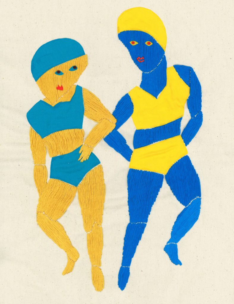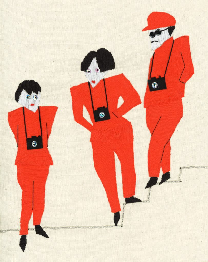 浅間明日美さんの作品の特徴の一つが「刺繍」という表現手法。育児をしながらでも創作活動を継続できるという理由で選ばれたとあって、奇をてらうでもなく、まるでドローイングのように作品に馴染み、その質感で見る側を楽しませてくれます。
